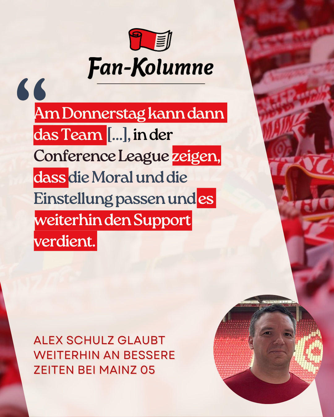 Am Donnerstag kann dann das Team erste einmal in der Conference League zeigen, dass die Moral und die Einstellung passen und sie weiterhin den Support verdienen. Denn schließlich kann man als Mainz 05 Spiele verlieren und wird dennoch gefeiert, solange alles in die Waagschale geworfen wurde. Selbiges gilt dann für das Spiel gegen die Bayern. Fußballdeutschland erwartet vermutlich, dass wir dort zweistellig abgeschlachtet werden. Eine gute Gelegenheit, um alle eines Besseren zu belehren.